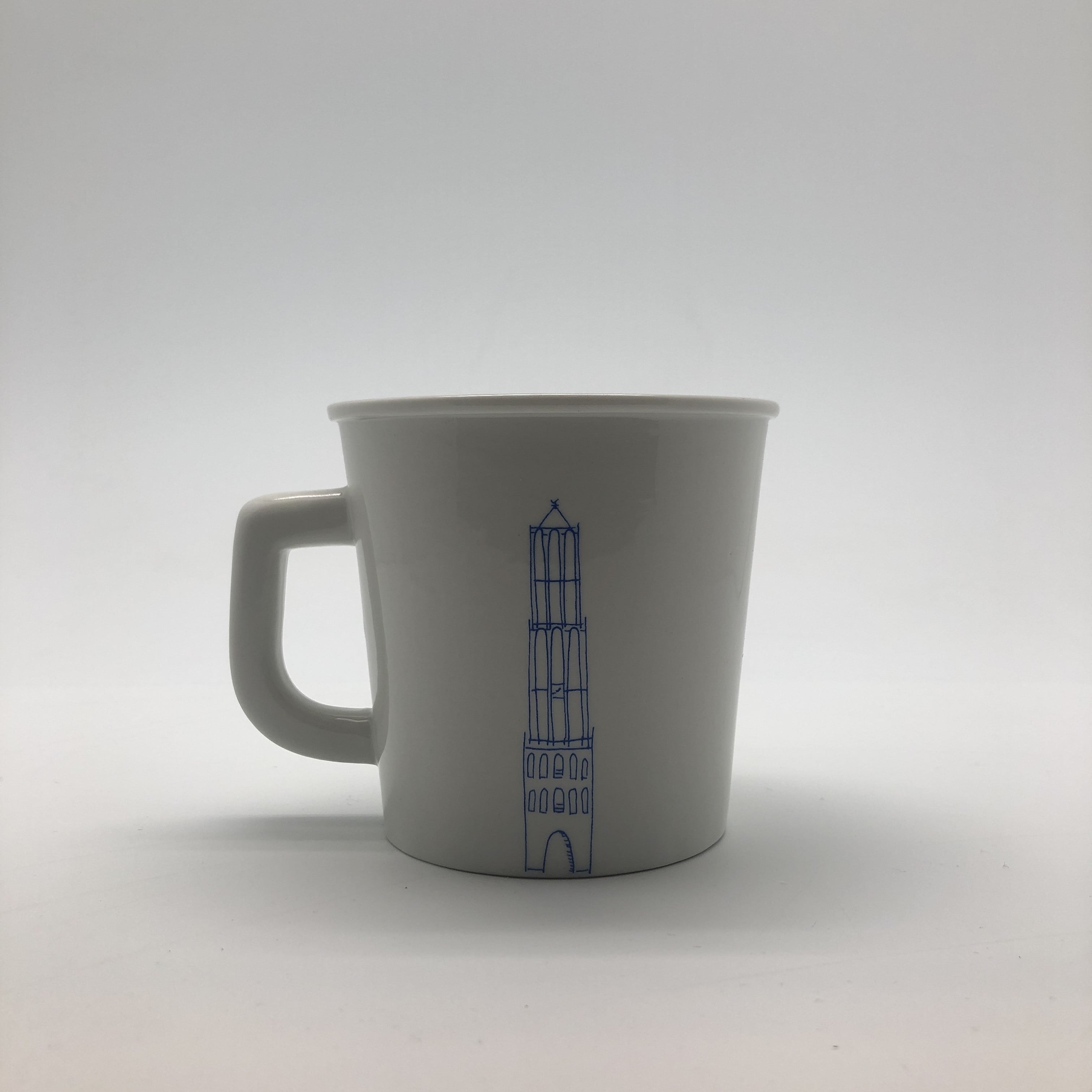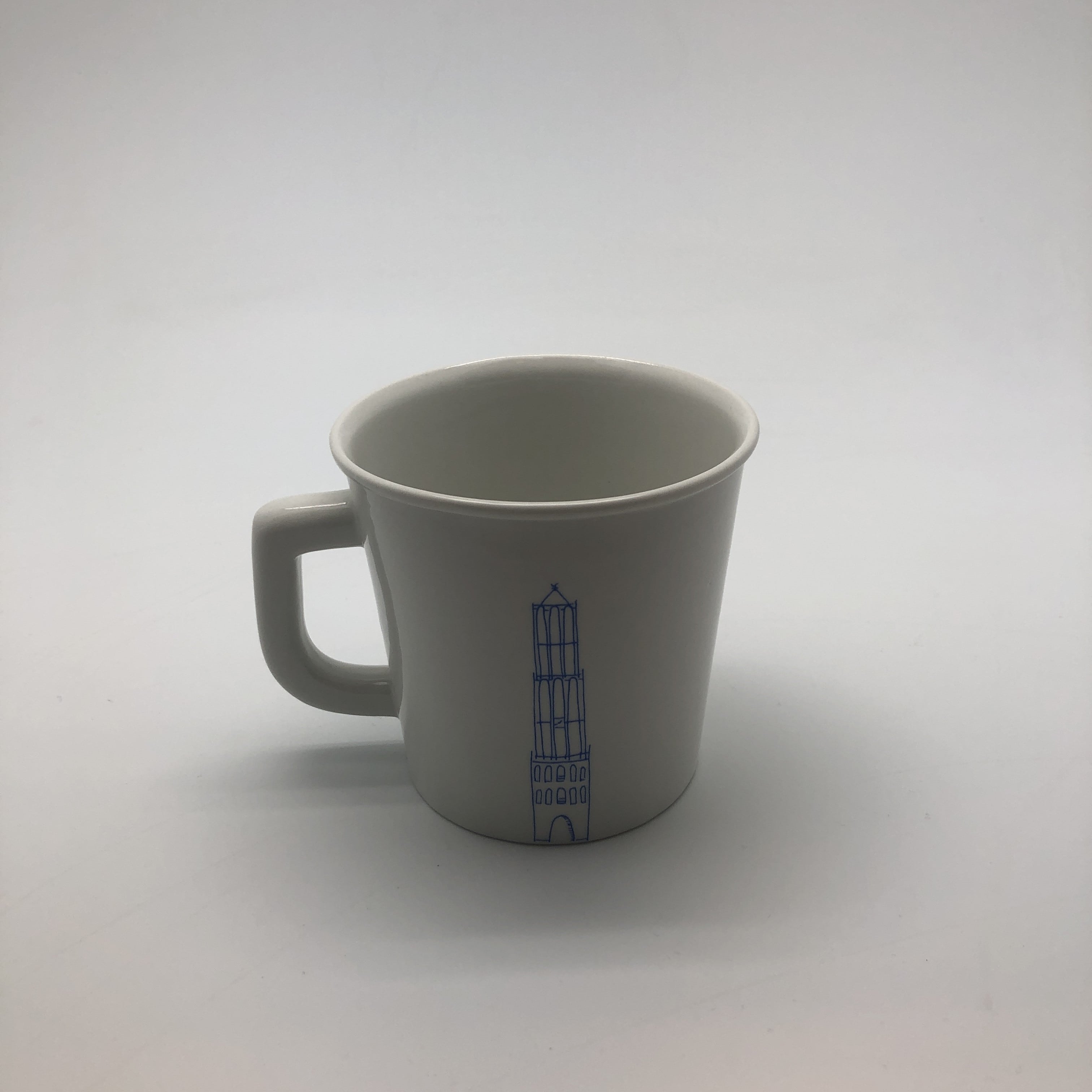 Handgemaakte mok met oor en blauwe domtoren print. 300 ml.