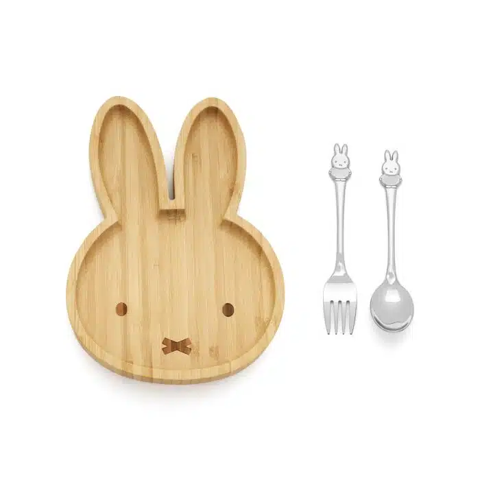 Eten wordt nóg leuker met nijntje. En al helemaal van dit bamboe bordje in de vorm van het konijn met zuignap. De set wordt compleet gemaakt door het tweedelige 18/10 RVS bestekje, eveneens voorzien van nijntje