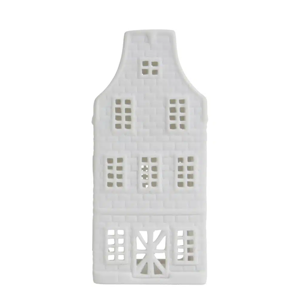 Deze waxinehouder in de vorm van een grachtenhuisje is gemaakt van