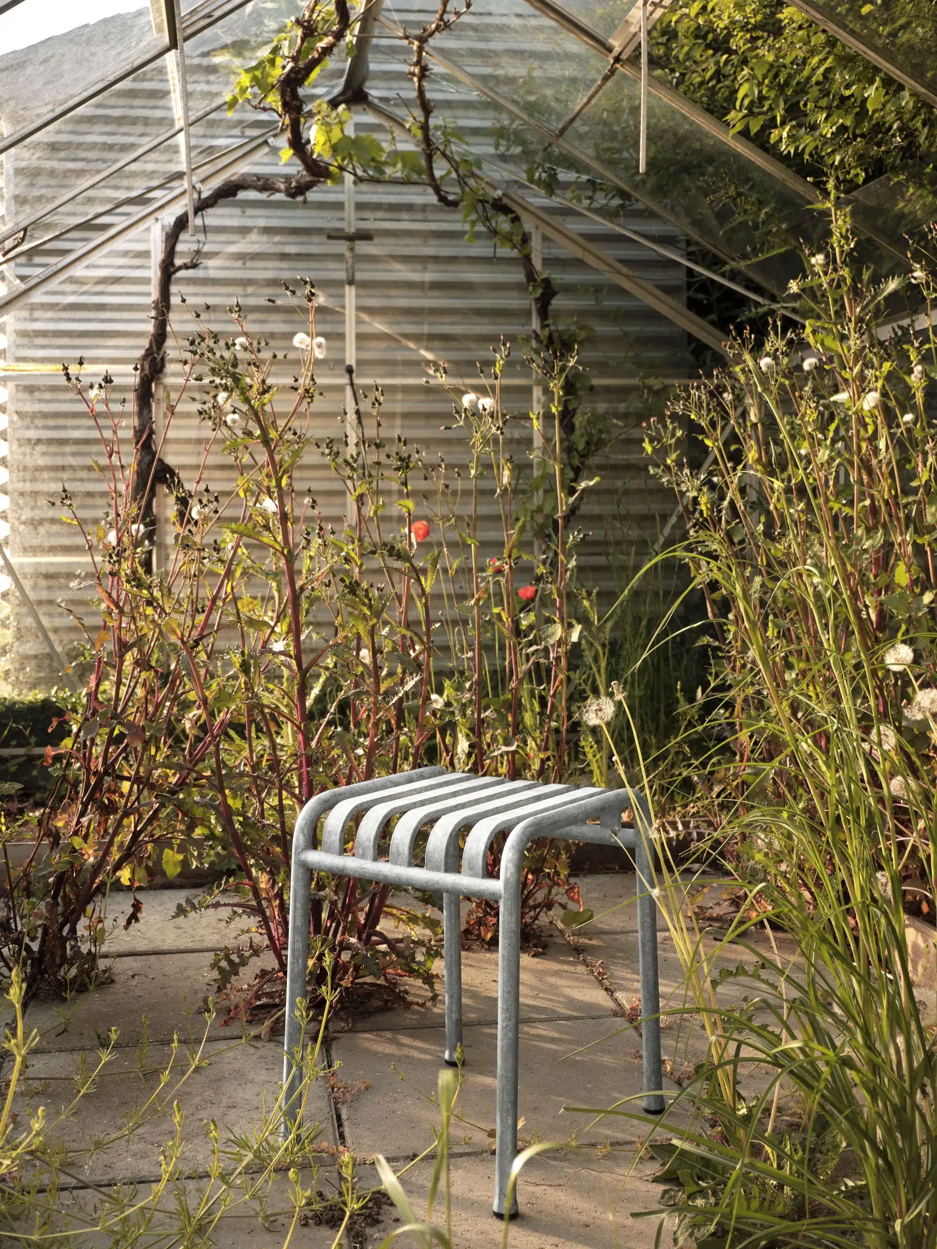 The Palissade Stool maakt deel uit van de Hay buitencollectie. Gemaakt van powder coated steel (Sky Gray, Anthracite, Olive) of verzinkt staal (Hot Galvanised).