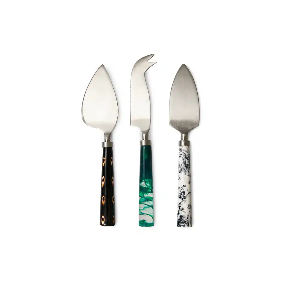 Drie verschillende kaas messen van HKliving in de verfrissende kleuren coast. Ideaal voor op de borrelplank of om iemand cadeau te geven.