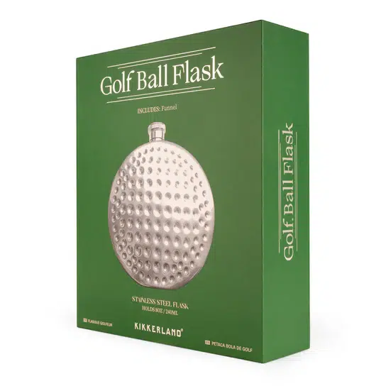 Een stijlvolle heupfles in de vorm van een golfbal.