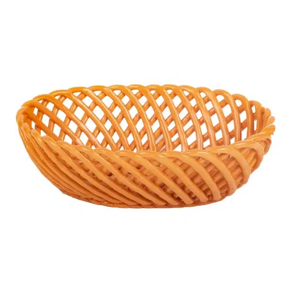 Dit ovale oranje porseleinen mandje is een stijlvol en praktisch item voor in huis. Het gevlochten ontwerp maakt het ideaal voor het opbergen van fruit of andere kleine spullen