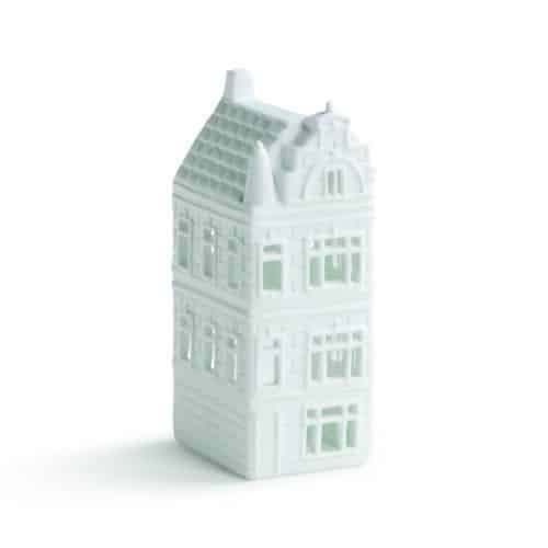 Deze waxinehouder in de vorm van een grachtenhuisje is gemaakt van