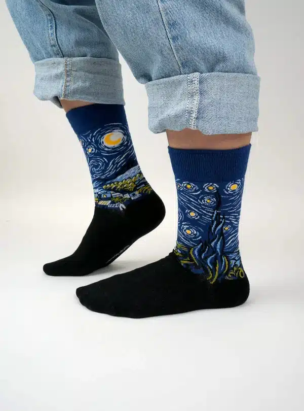 Het ontwerp van de sokken weerspiegelt de wervelende sterrenhemel en levendige kleuren van Van Gogh’s meesterwerk, waardoor je een stukje kunstgeschiedenis met je meedraagt.