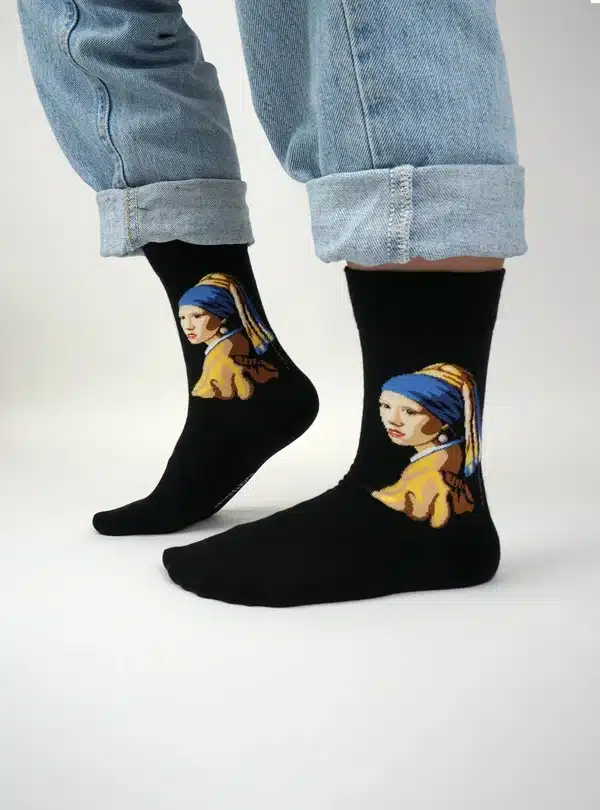 Breng een stukje Nederlandse kunstgeschiedenis tot leven met deze stijlvolle sokken geïnspireerd op Johannes Vermeer’s meesterwerk Meisje met de Parel. Deze sokken combineren klassieke schoonheid met modern comfort, waardoor je elke stap in stijl zet.