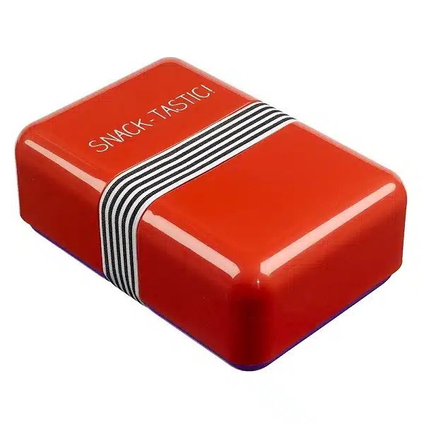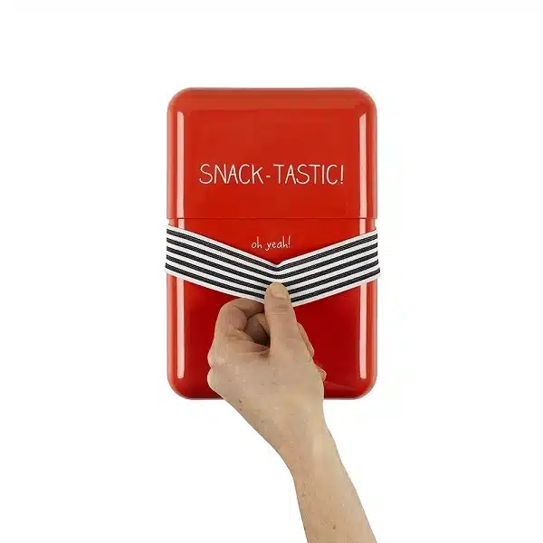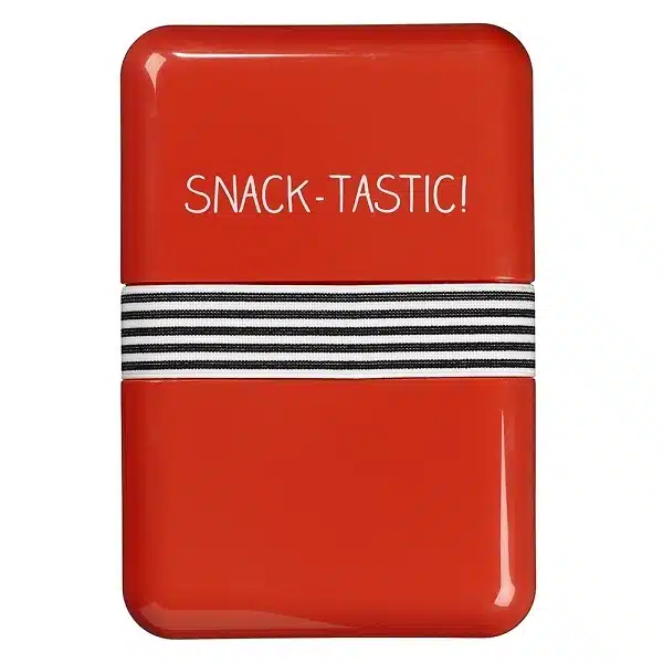 Een vrolijke lunchtrommel in groot formaat waar echt alle broodjes, fruit en tussendoortjes in passen. De trommel komt met een elastiek zodat deze niet zomaar open gaat in je tas. De bovenkant van de trommel is rood, de onderkant paars. Ook verkrijgbaar in andere kleuren en formaten met andere teksten.
