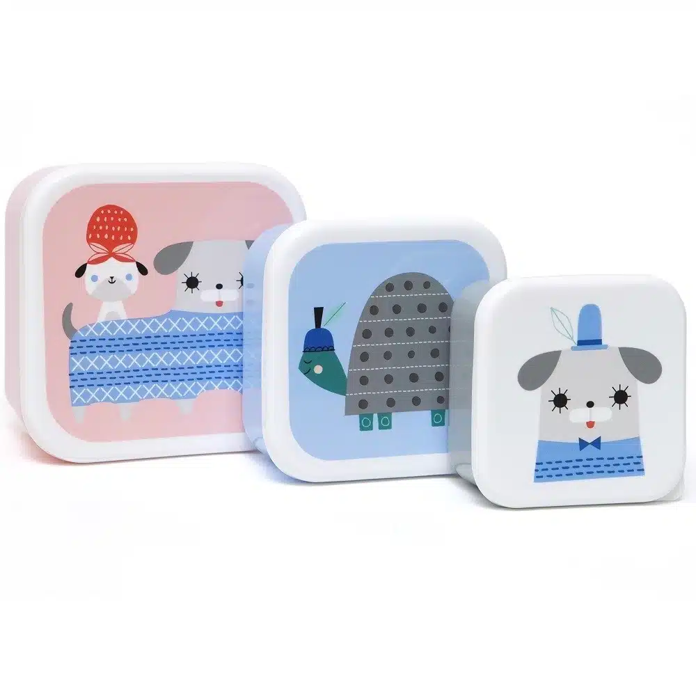 Deze leuke set van 3 snack boxen is versierd met alle vriendjes van Peanut.