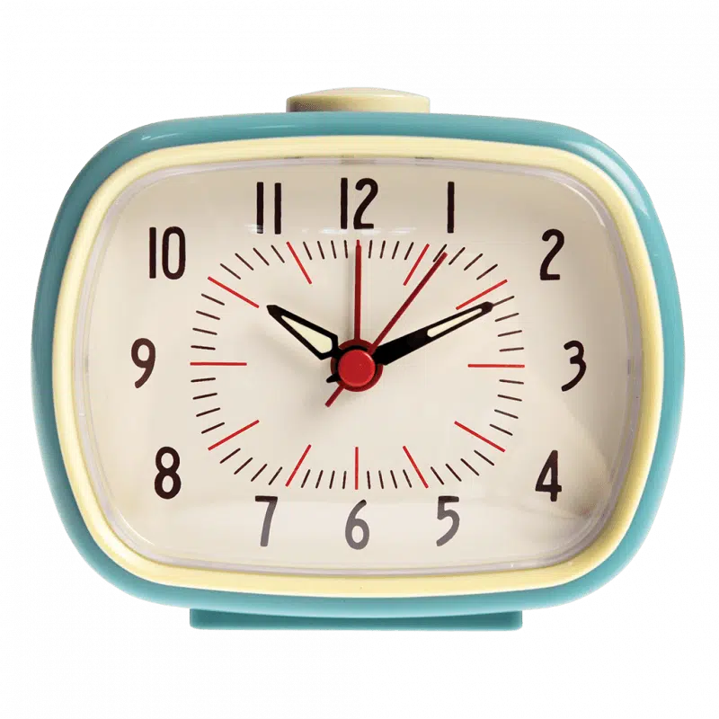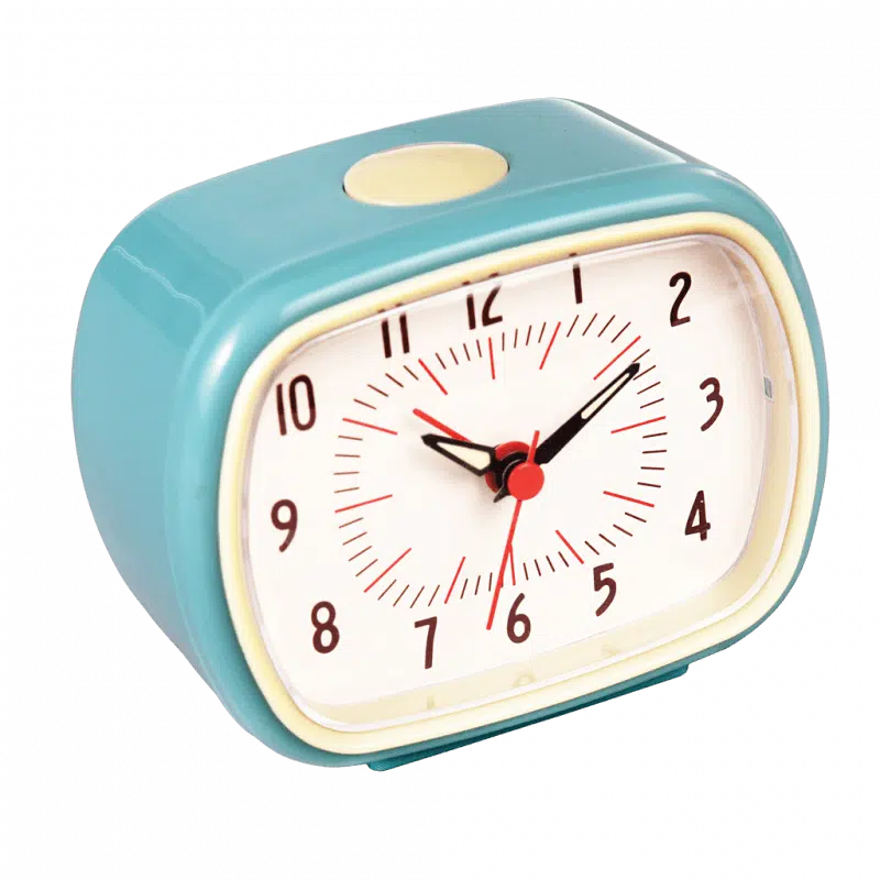 Retro stijl blauwe wekker met glow in the dark wijzers.