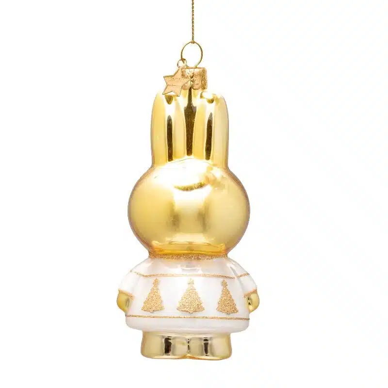 Laat je kerstboom stralen met dit betoverende glazen ornament van Vondels: Nijntje schittert in een prachtig wit jurkje, versierd met gouden kerstboompjes.