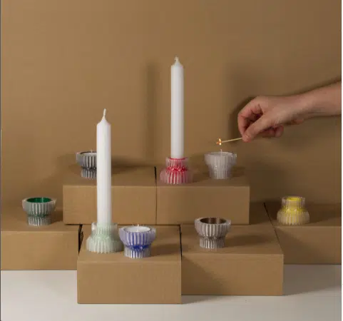 Deze 3D geprinte kandelaar van Warren & Laetitia wordt gemaakt van gerecyclede plastic flessen en composteerbaar bioplastic. Door zijn vorm is hij zowel geschikt voor waxinelichtjes als voor dinerkaarsen.